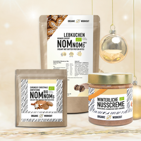 Lebkuchen: Bio-Mandelmus, Bio-Haselnussmus, Bio-Molkeneiweißkonzentrat (Milch), Bio-Kokosmehl, Süßungsmittel: Bio-Erythrit, Bio-Lebkuchengewürz (Zimt, Koriander, Anis, Piment, Nelken, Sternanis, Kardamom, Ingwer, Bourbon-Vanille), Salz Zimt-Orange: Bio-Cashewmus, Bio-Haselnussmus, Bio-Kokosmehl, Bio-Ceylon-Zimt, Süßungsmittel: Bio-Erythrit, Bio-Orangenöl, Salz